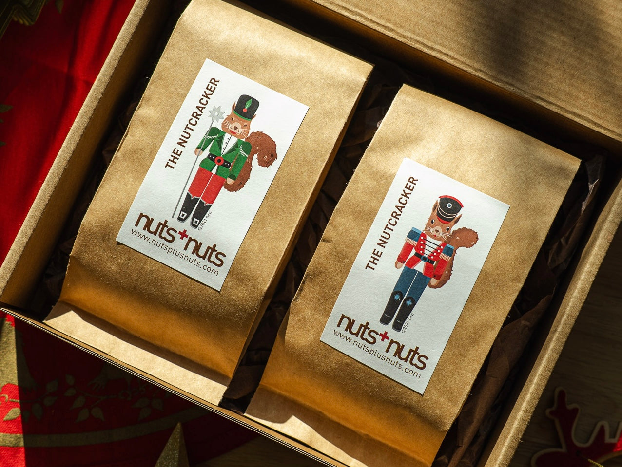 This Nutcracker holiday gift box features two of our best-selling gourmet nuts: Chili Lime Leaves Cashews and Rosemary Maple Sea Salt Almonds. Each bag includes 7 oz of premium, small batch roasted nuts. A perfect host gift or employee gift.